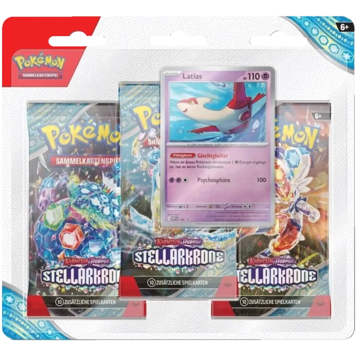Jedes Stellarkrone Latias Blister enthält drei Booster Packs aus der Erweiterung Stellarkrone der Karmesin & Purpur-Ära. Zusätzlich ist noch die namensgebende Promo-Karte mit Latias enthalten, welche es nur in diesen Blistern gibt.
